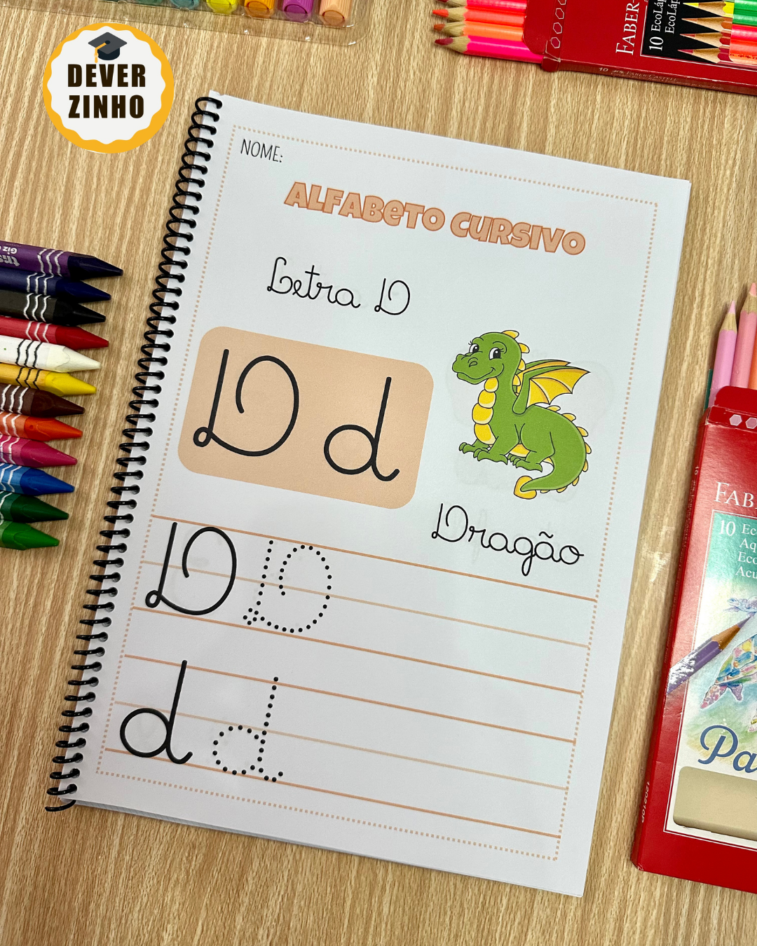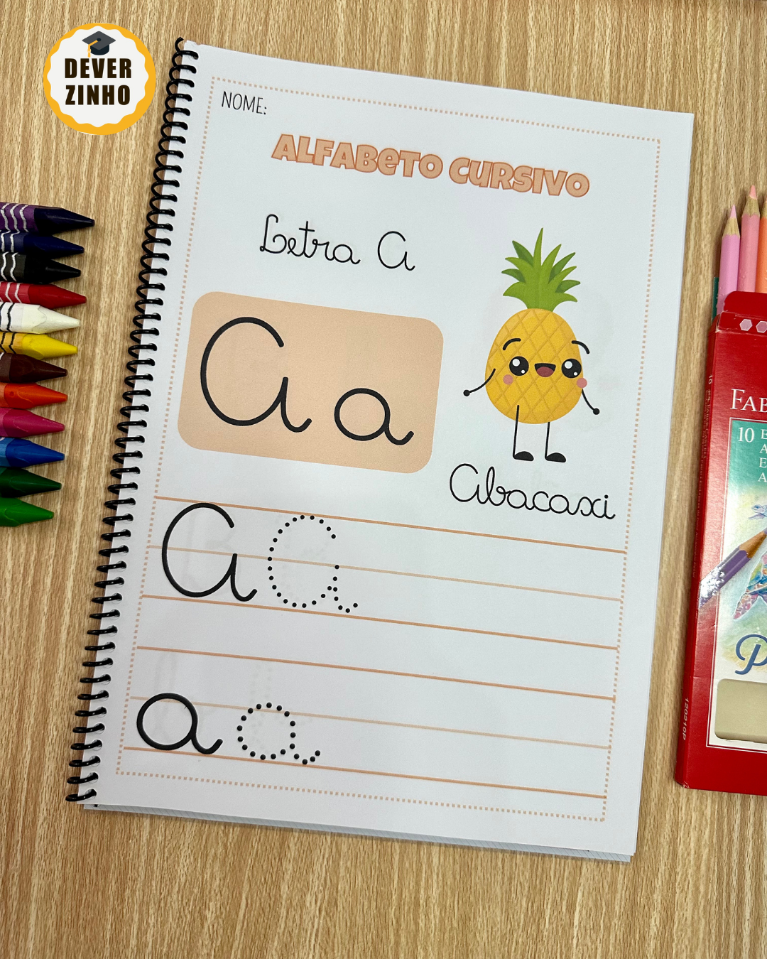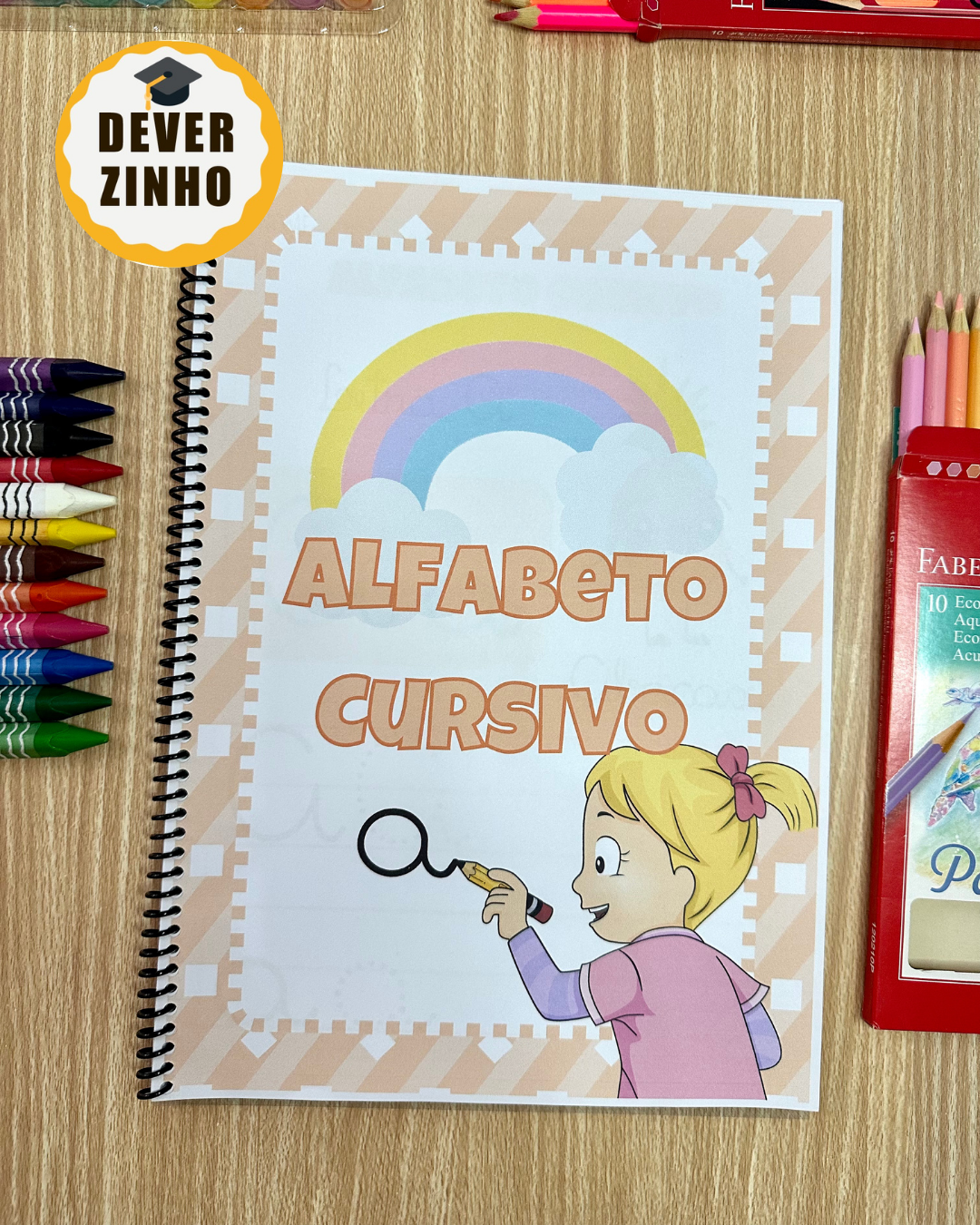 A apostila Alfabeto cursivo inclui atividades para o treino do traçado cursivo de todas as letras do alfabeto, tanto no formato maiúsculo como minúsculo.