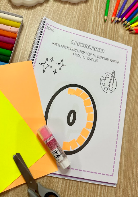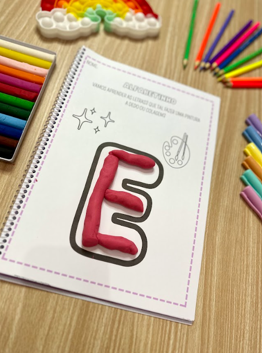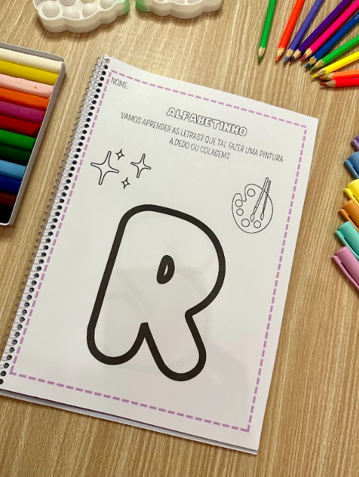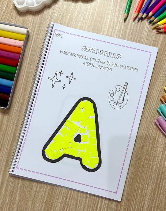 A apostila Alfabetinho inclui atividade para todas as letras do alfabeto, em que a criança irá explorar a forma de cada letra, com tinta, colagem, massinha ou outro material disponível. Essa atividade pode ser explorada de diferentes maneiras, pois podemos também incentivar as crianças a reproduzirem o som de cada letra, fazer seu traçado com o dedo e associar com imagens que iniciam com essa letra, podendo recortar esse material de revistas ou panfletos.