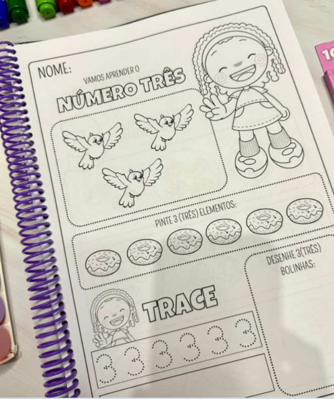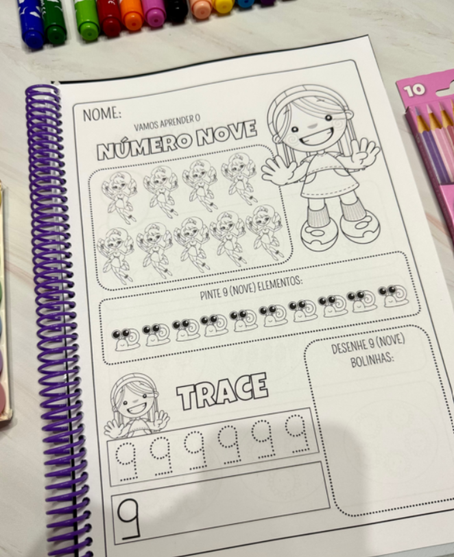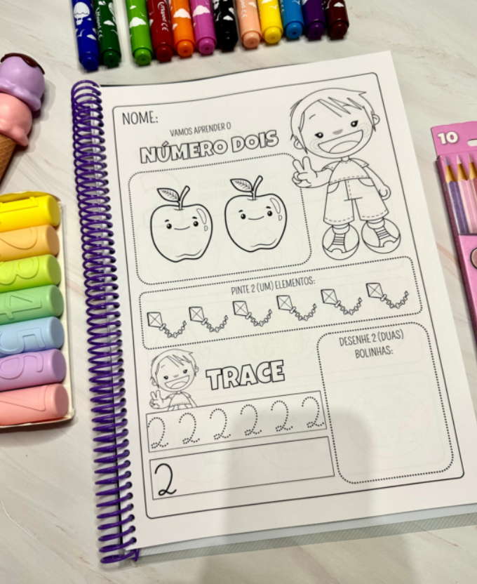 As atividades são para colorir e desenvolvem habilidades importantes para crianças a partir da educação infantil. São duas páginas de atividades para trabalhar cada numeral, e essa proposta trabalha: