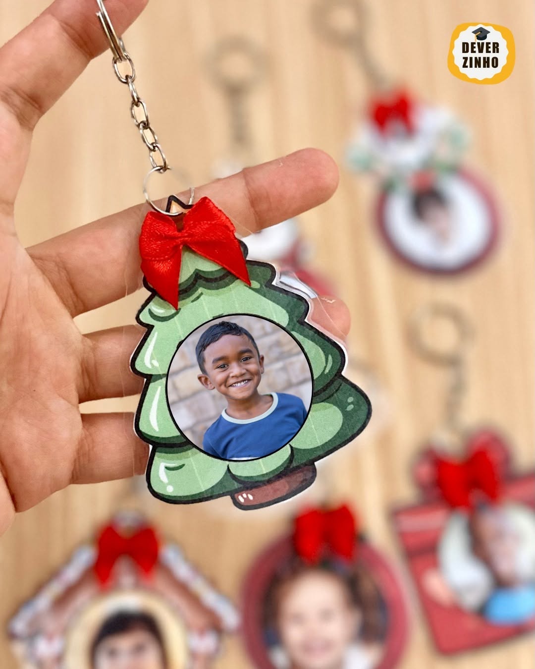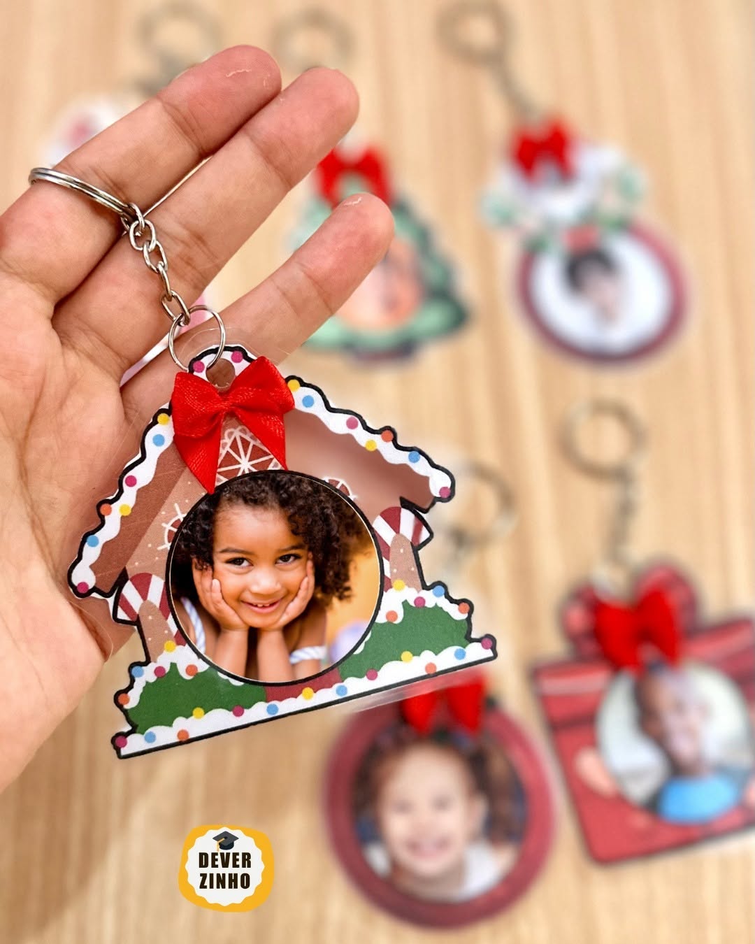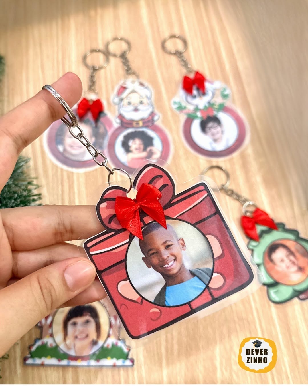 Arquivos com 6 modelos de chaveiros tema Natal, com opção de personalizar com a foto da criança.