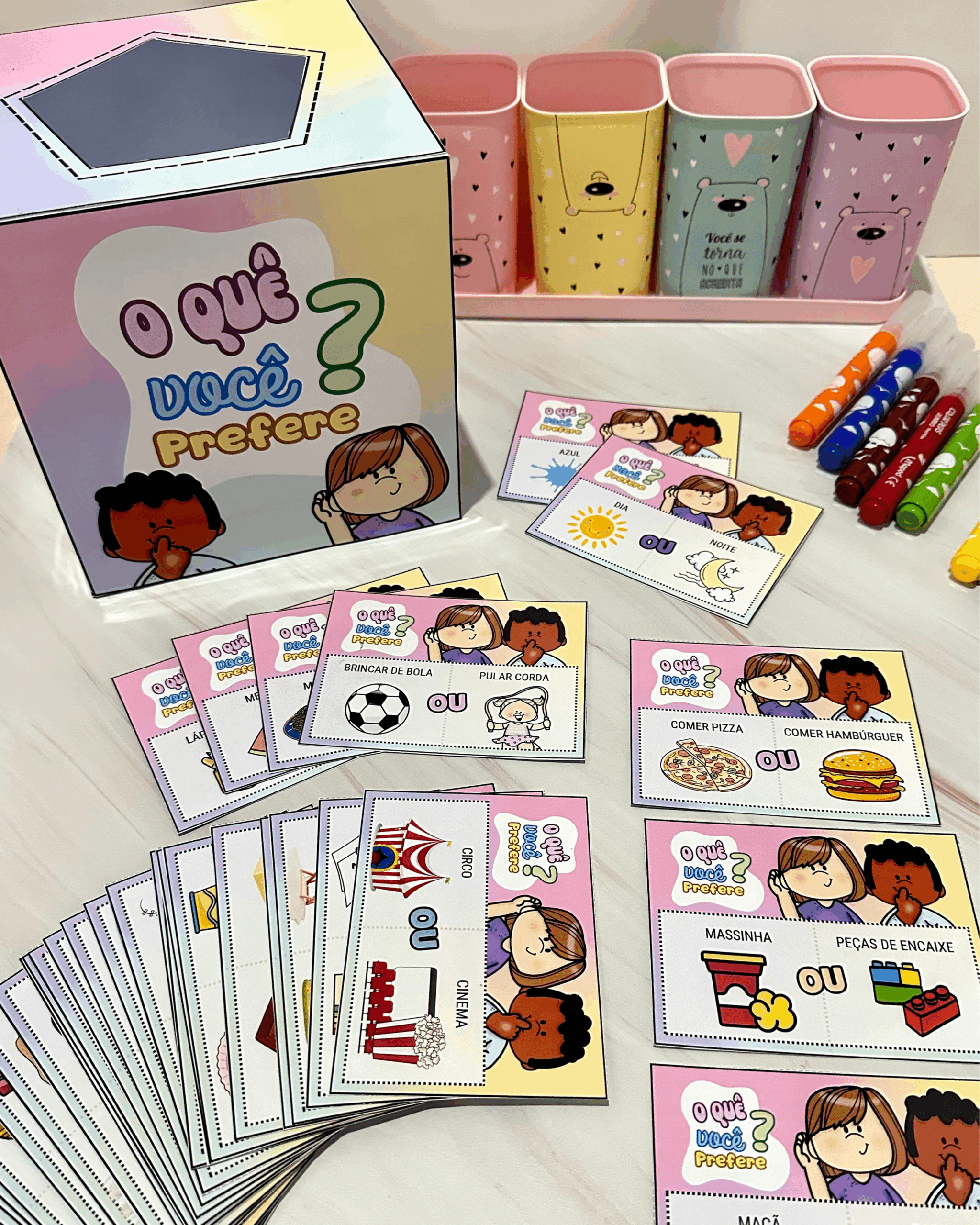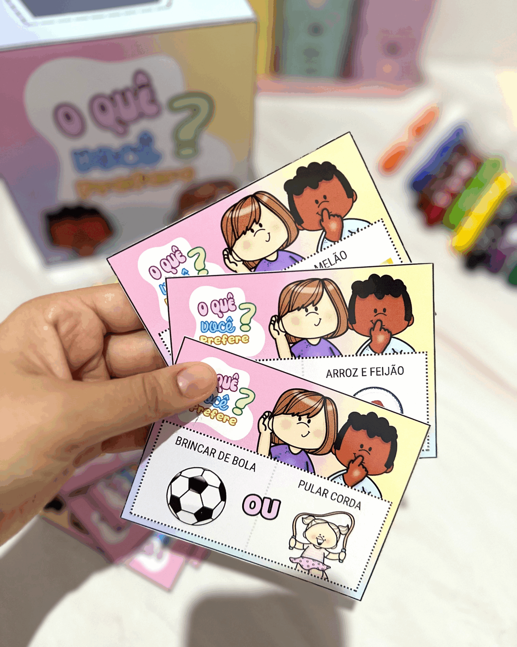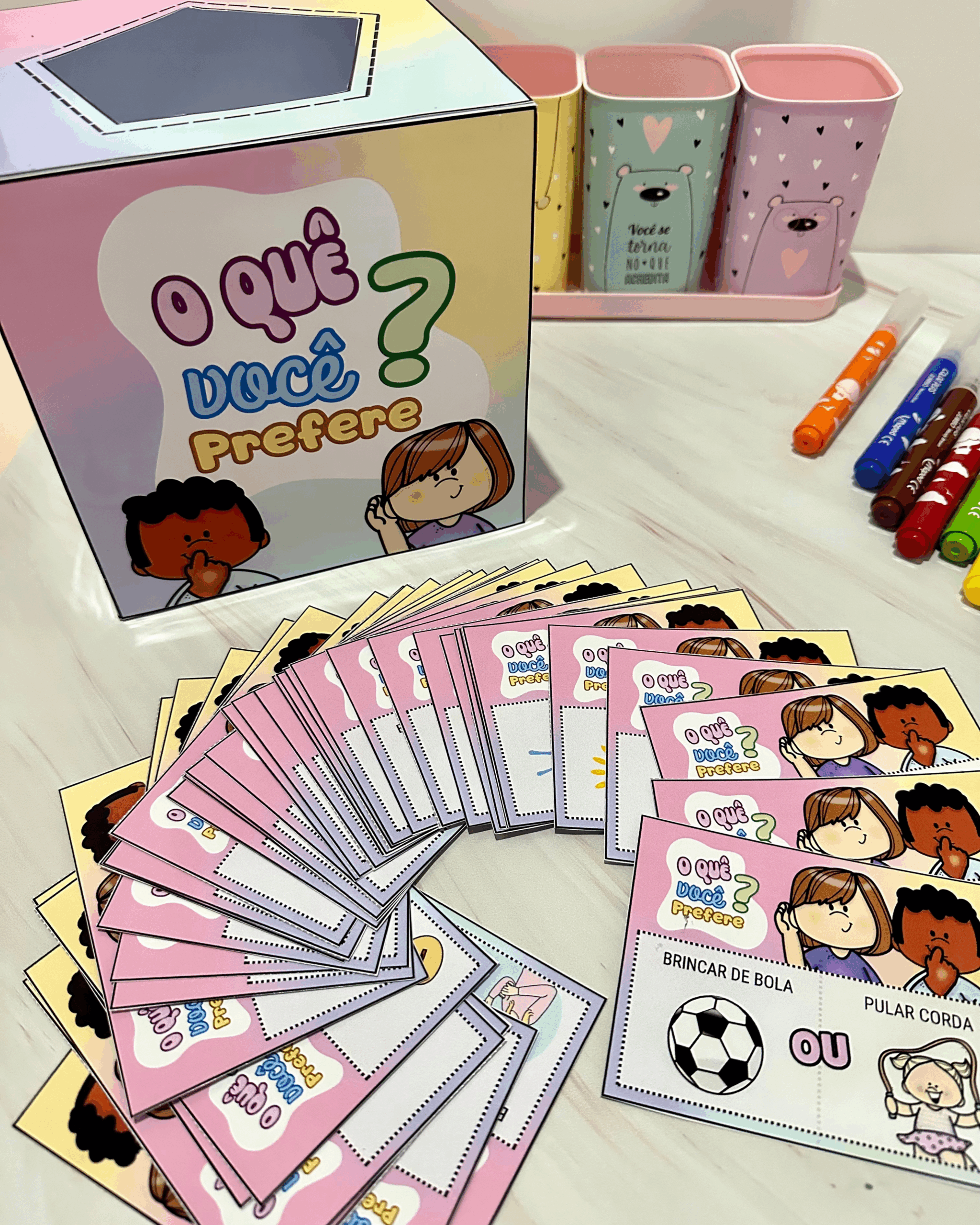 Dinâmica “O que você prefere?” com 36 fichas e caixa para utilizar durante a brincadeira. Com essa atividade, as crianças podem aprender a expressar suas opiniões e preferências, além de desenvolver o respeito e a tolerância às escolhas dos outros.