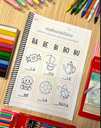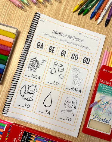 Na proposta a criança deverá completar as palavras com a sílaba faltosa, estimulando o aprendizado das famílias silábicas e fortalecendo seu processo de alfabetização. São 6 palavras para completar em cada atividade, com as figuras para colorir.