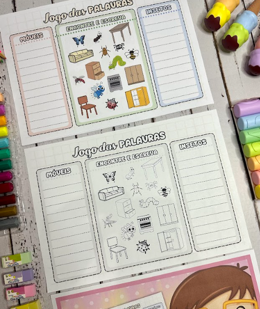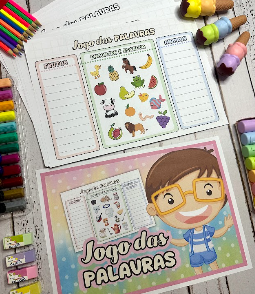 O arquivo Jogo das Palavras inclui 20 páginas de atividades, com figuras para a criança identificar a categoria e escrever nas colunas correspondentes.
