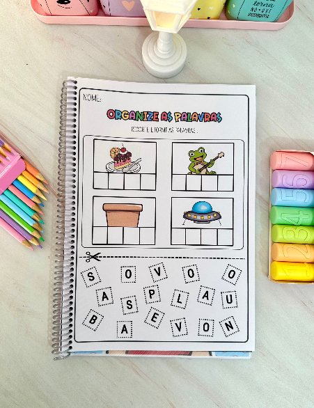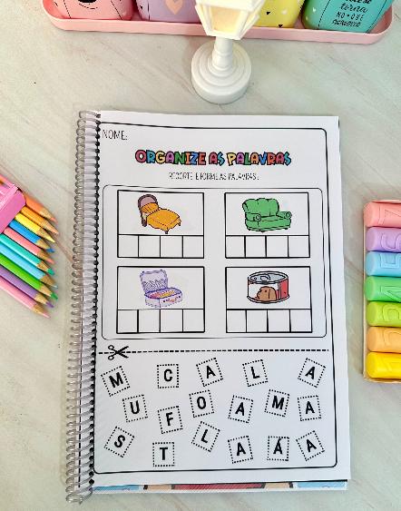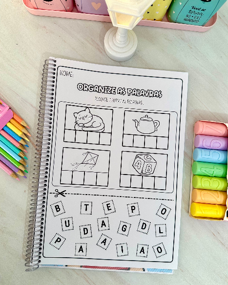 Nessa proposta a criança deve recortar e colar as letras corretamente para formar as palavras. As atividades vão na opção colorida e para colorir. No total são 32 páginas.