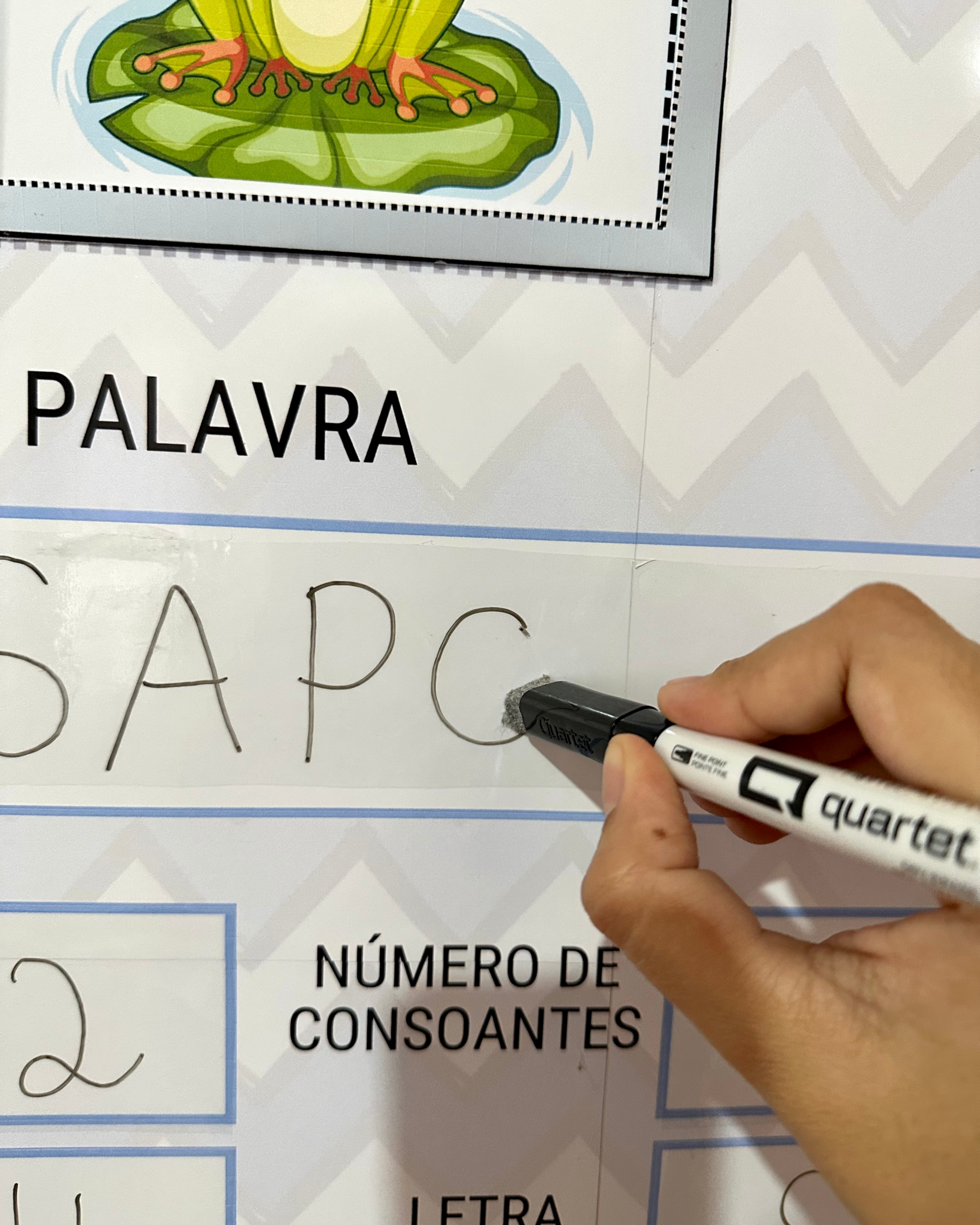 O arquivo possui páginas, contendo o cartaz já ampliado (9 folhas A4), inclui uma folha de registro individual para cada criança reproduzir a análise da palavra, e 150 cards com sugestões de palavras para serem utilizadas com o cartaz, sendo 80 fichas de palavras de sílabas simples e 70 fichas de palavras com sílabas complexas.
