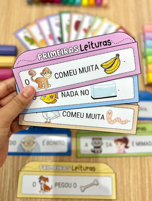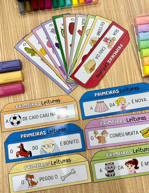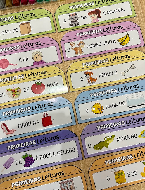 Nas fichas algumas palavras são substituídas por imagens, facilitando o processo de leitura e diminuindo o nível de desafios, para crianças com mais dificuldade na leitura.
