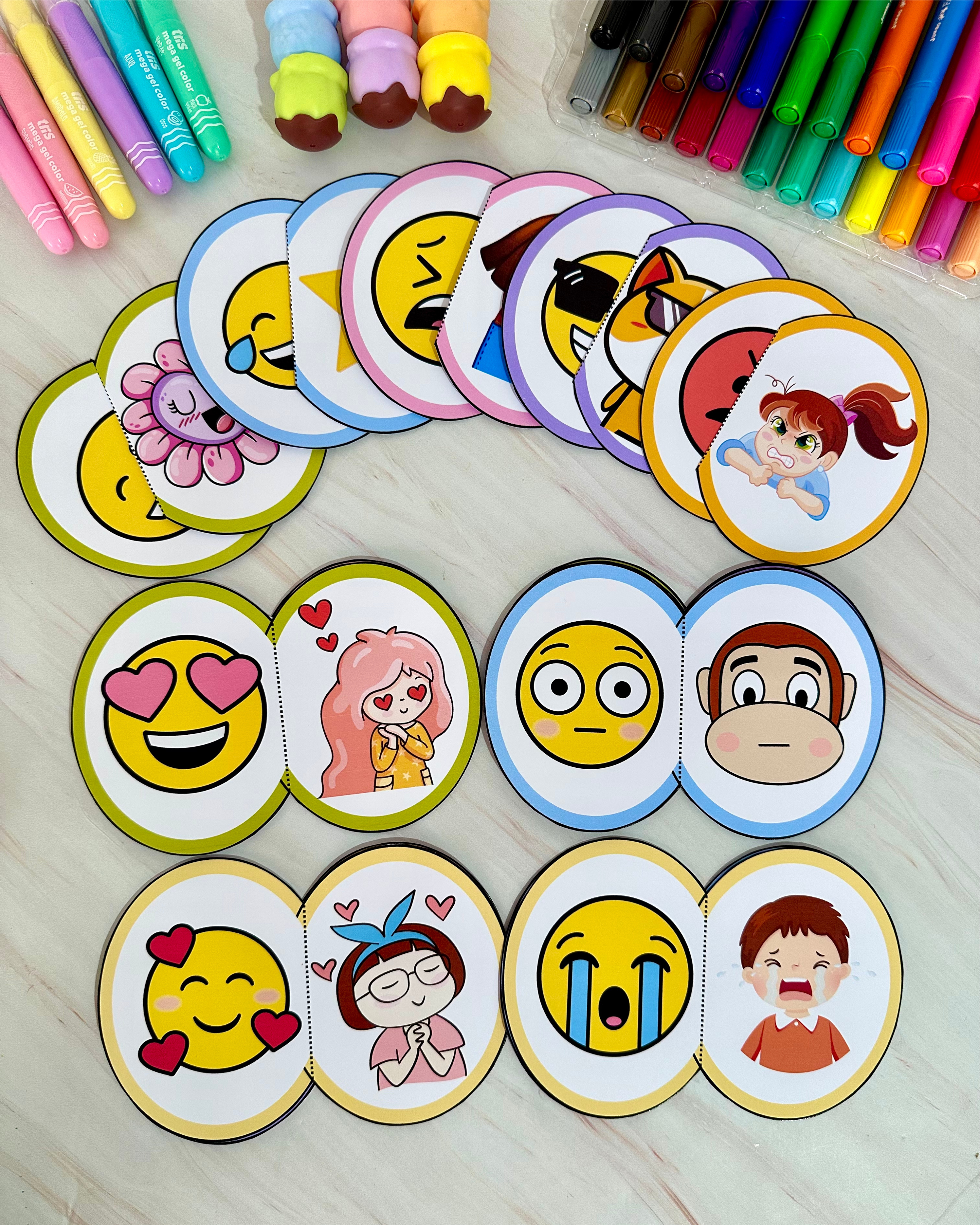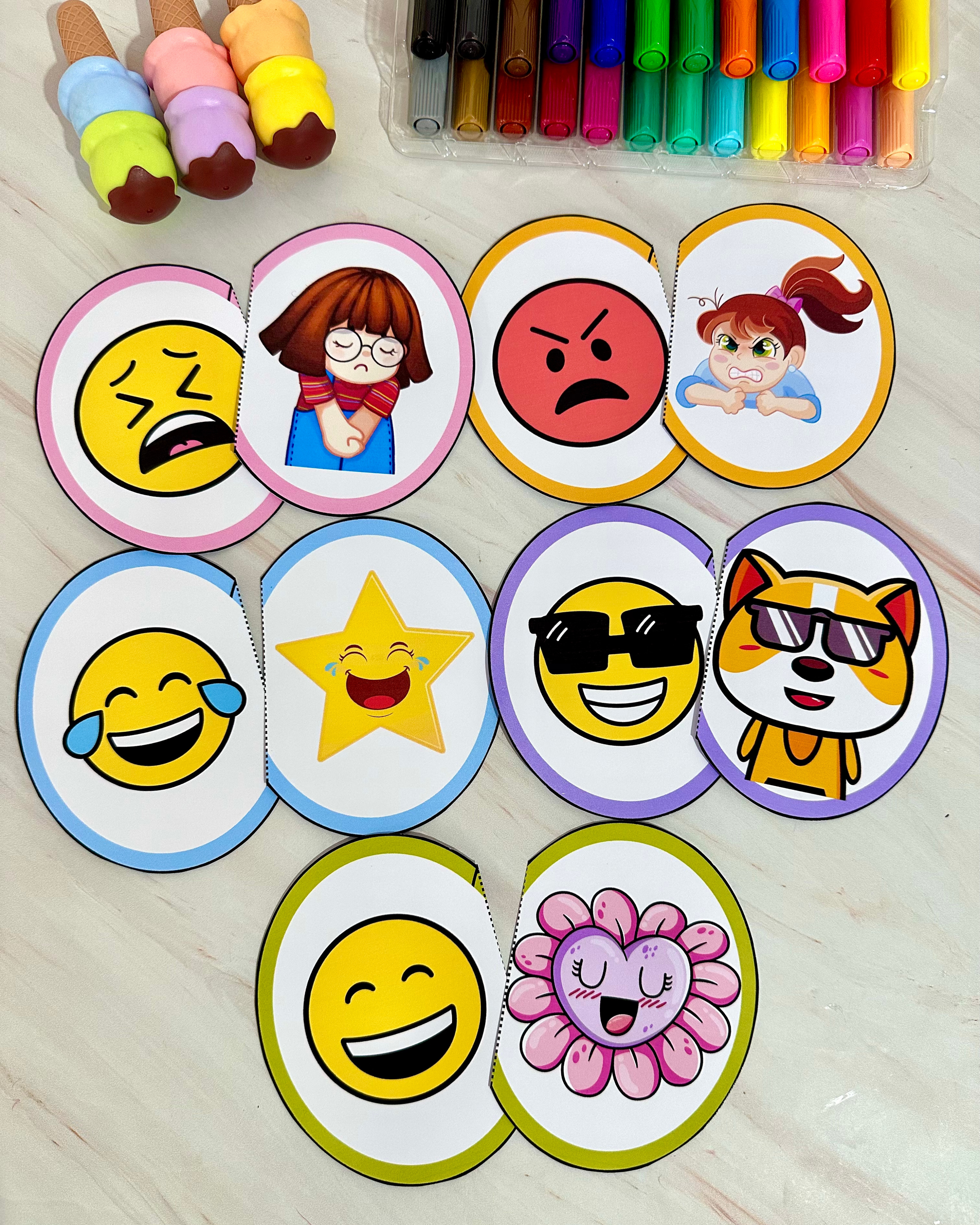 O material vai em PDF pronto para impressão, e inclui 20 Fichas. Este material utiliza peças de quebra-cabeça com imagens que representam diferentes emoções, permitindo que as crianças explorem e identifiquem