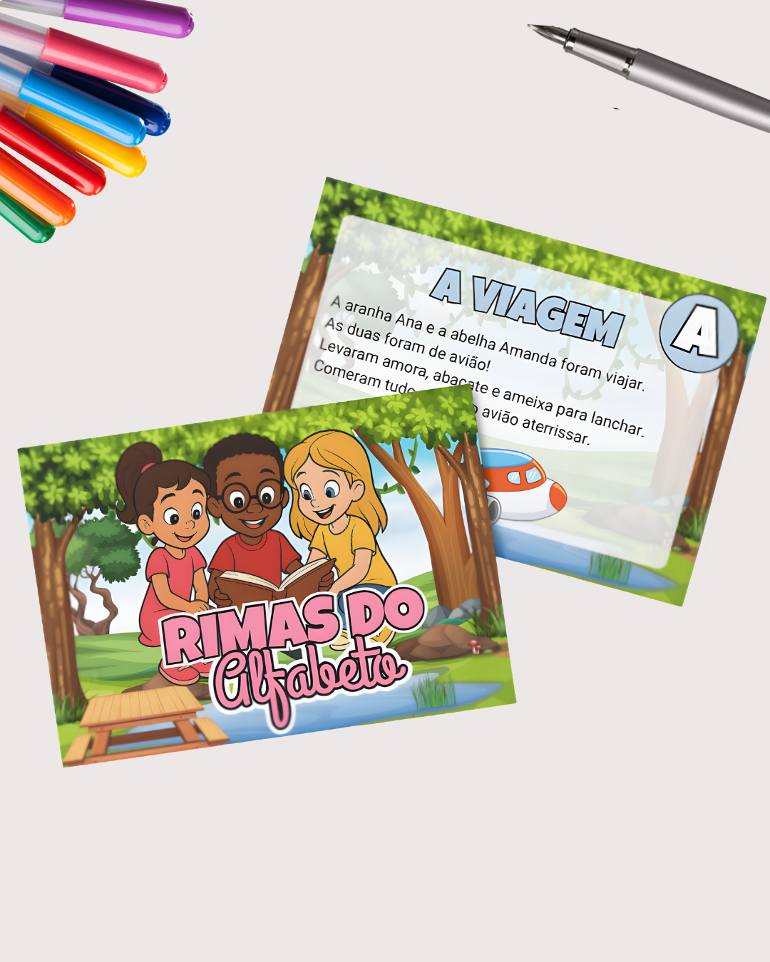 O arquivo Rimas do Alfabeto inclui 26 textos com rimas, um para cada letra do alfabeto, para treino de leitura de crianças em fase de