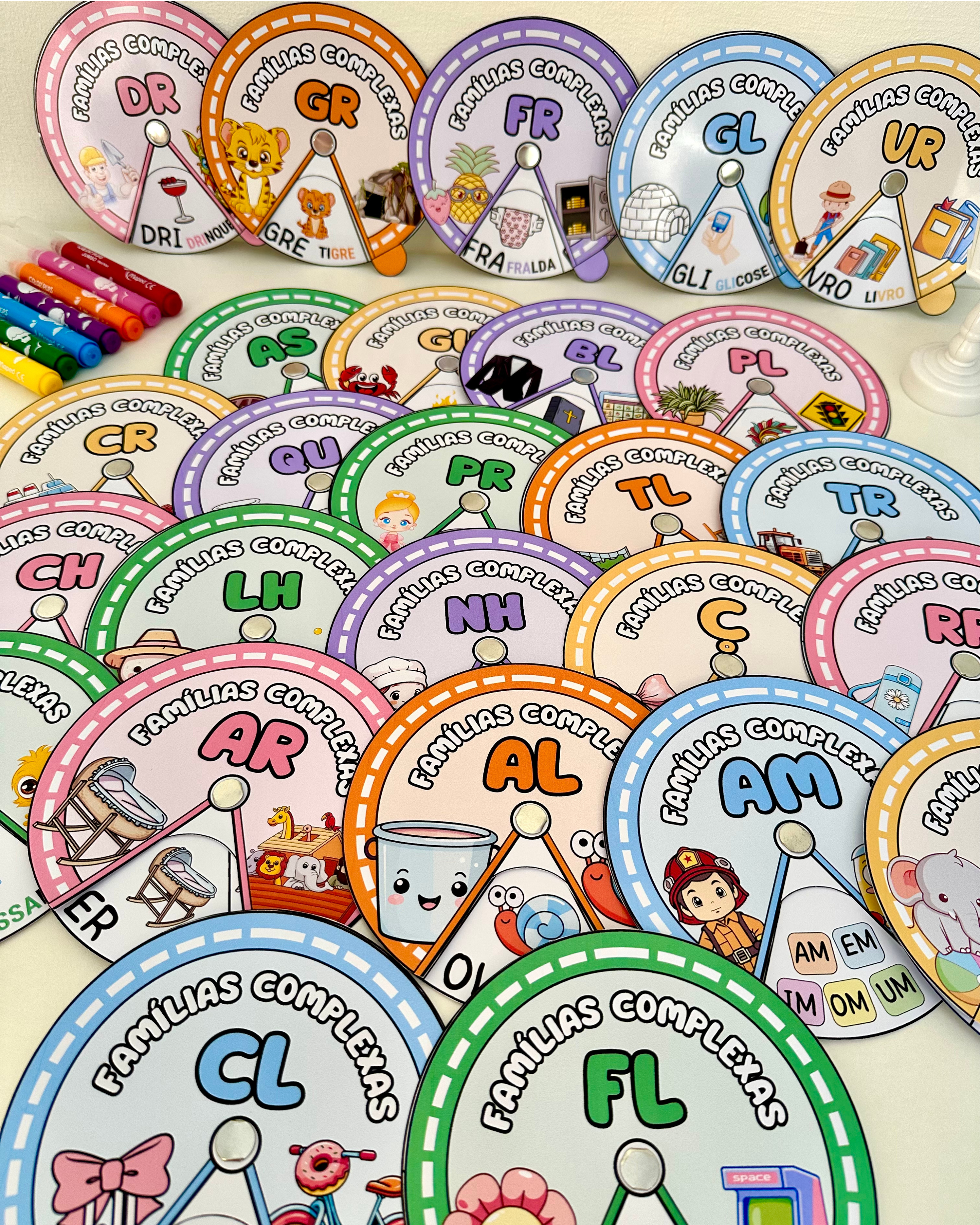O arquivo vai com a roleta de todas as famílias silábicas complexas, com 1 roleta por página, em PDF pronto para impressão.