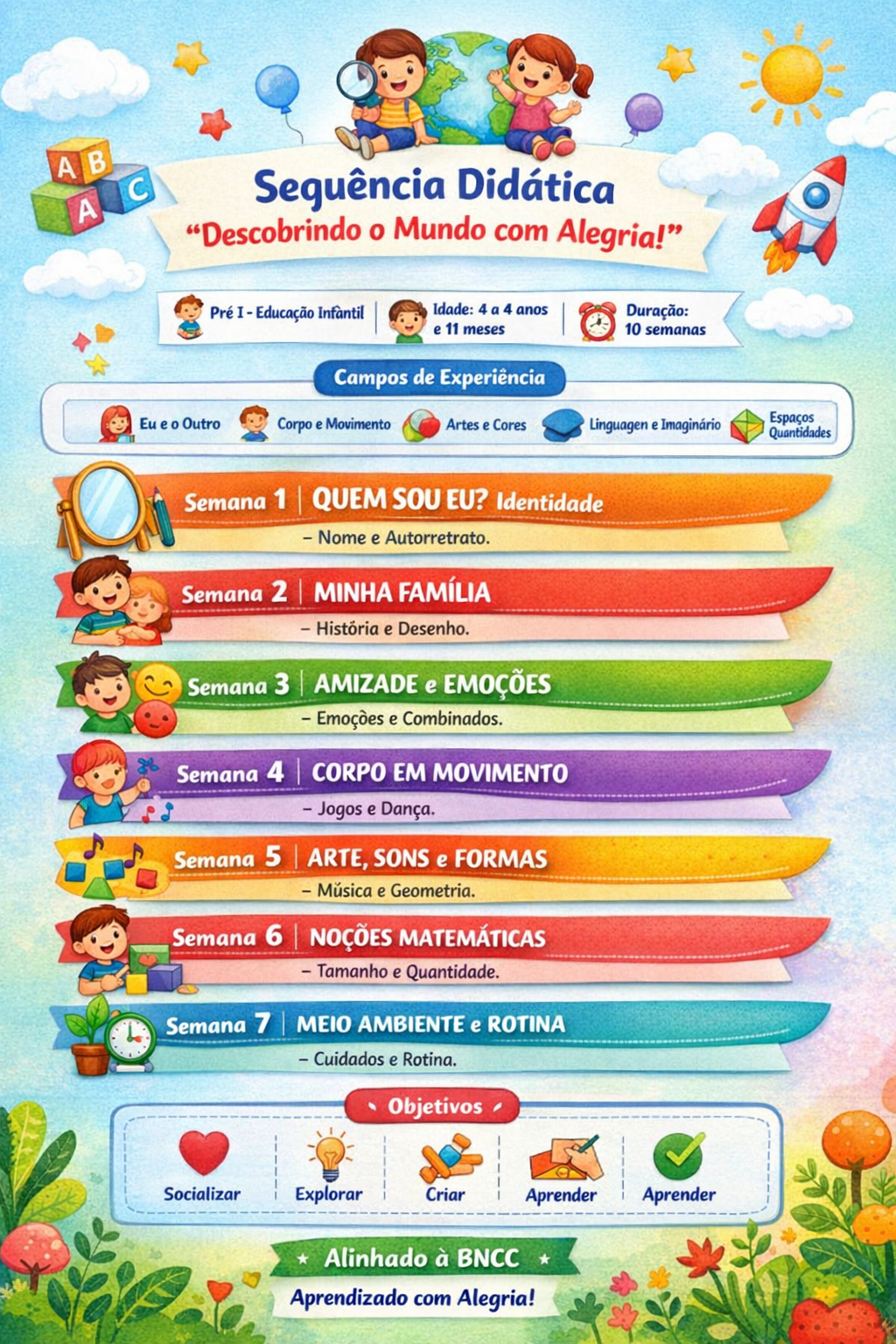 Sequência didática elaborada a partir da Apostila de Pré I, organizada para 10 semanas de trabalho, com atividades lúdicas, progressivas e alinhadas à BNCC.