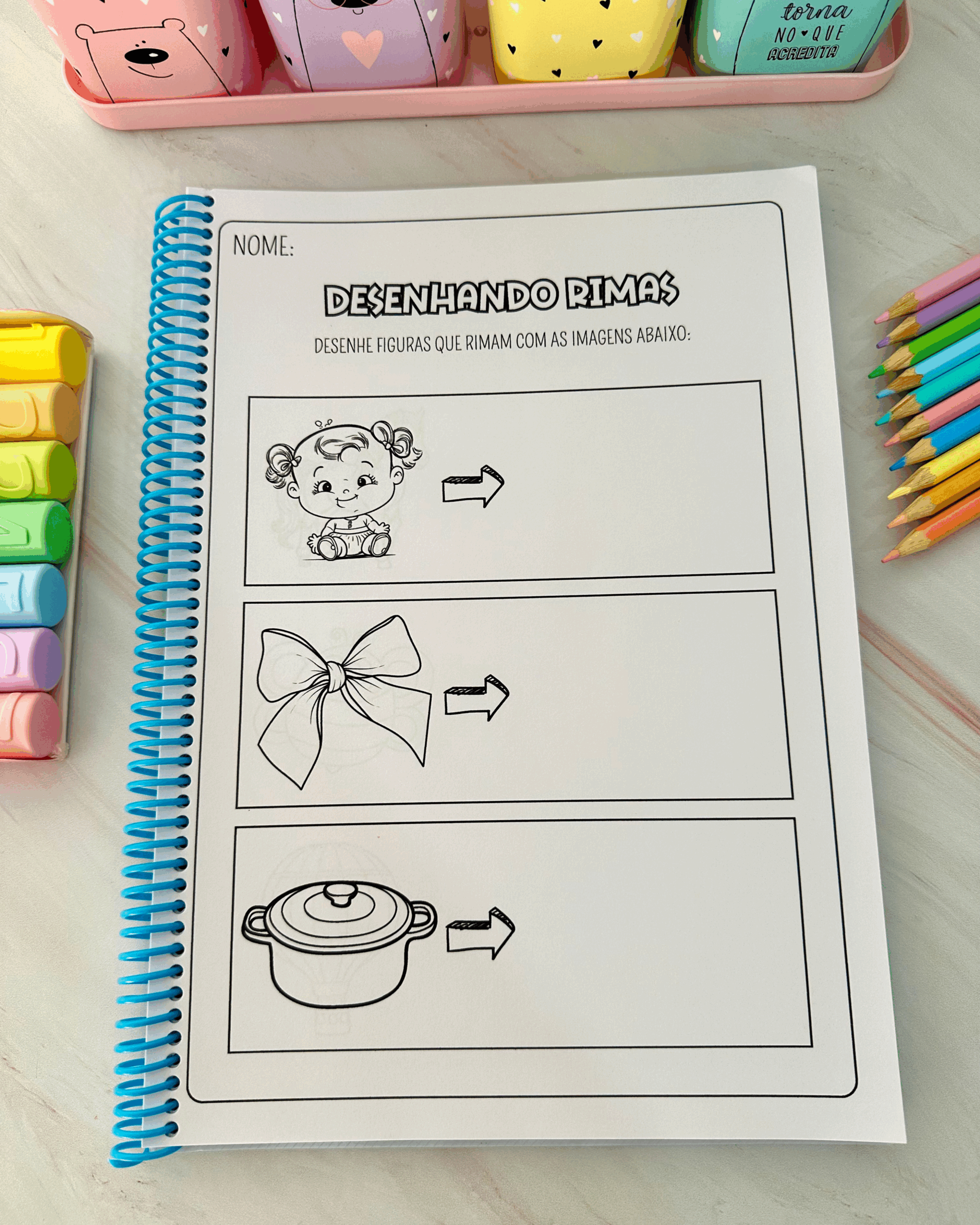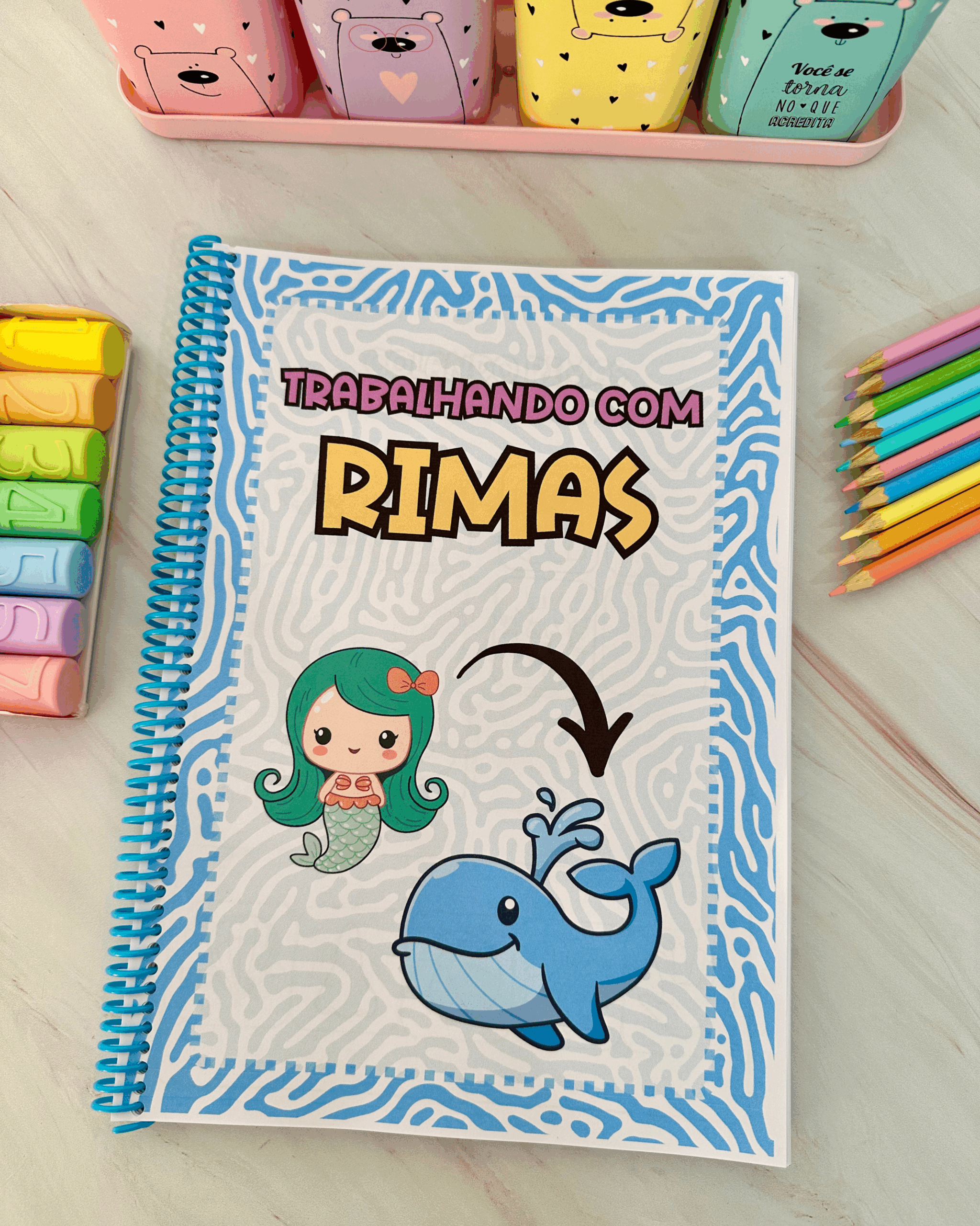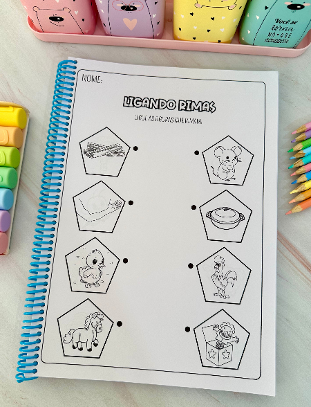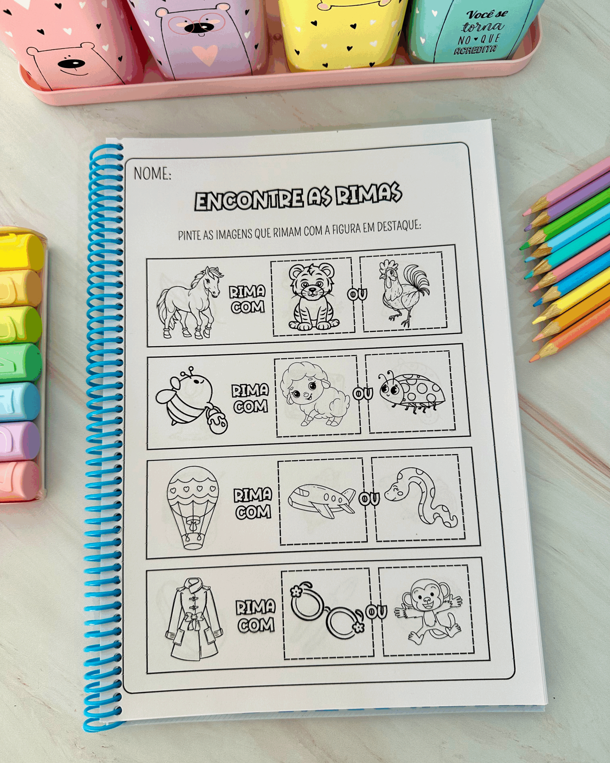 Apostila de atividades para trabalhar rimas com 85 páginas. As atividades são para colorir, e o material vai em PDF pronto para impressão.