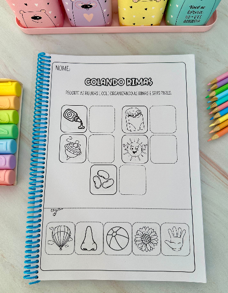 Nesse material você encontra propostas e formatos variados para trabalhar rimas, envolvendo recorte e colagem, pintura, ligar elementos, jogo das rimas e desenho.