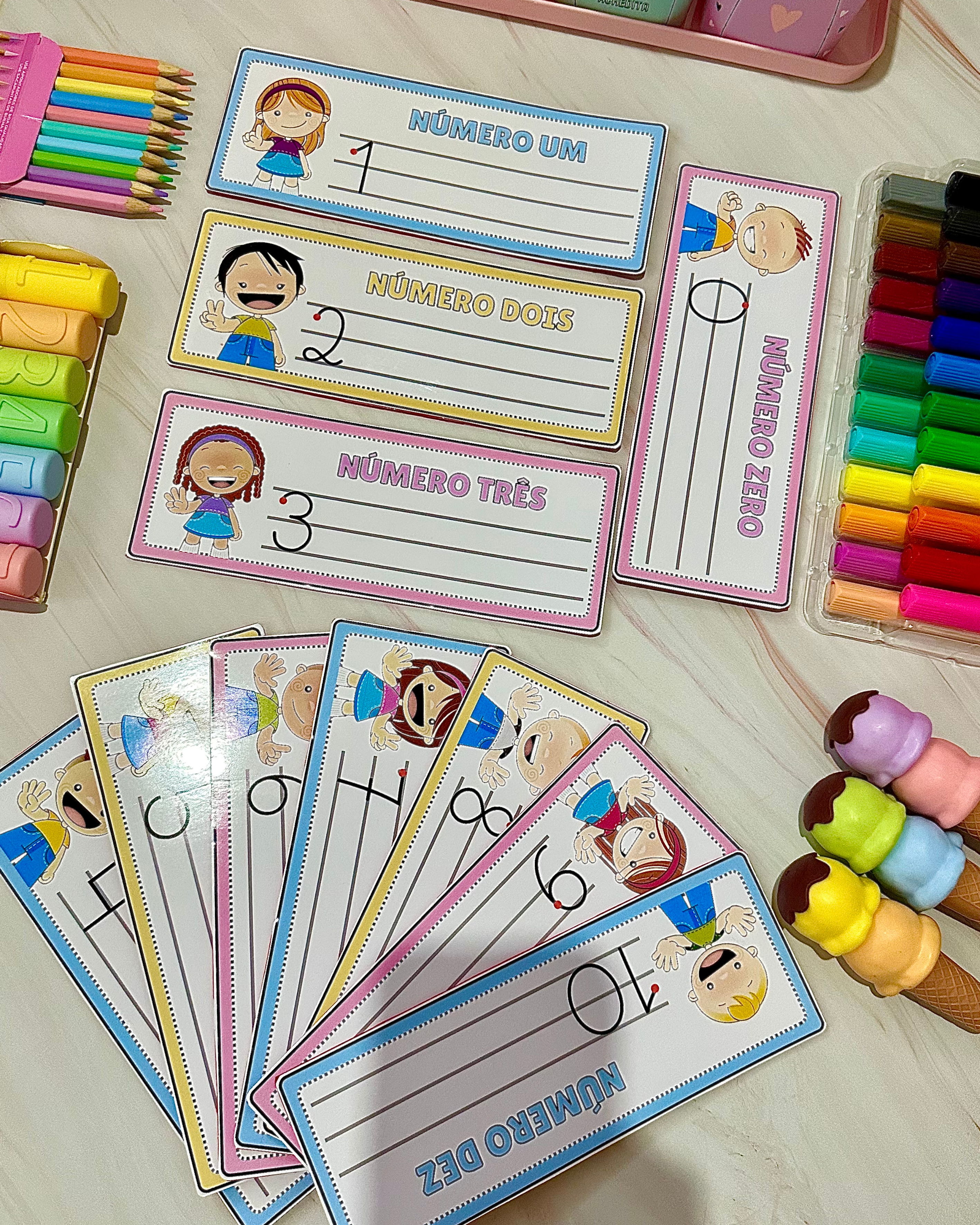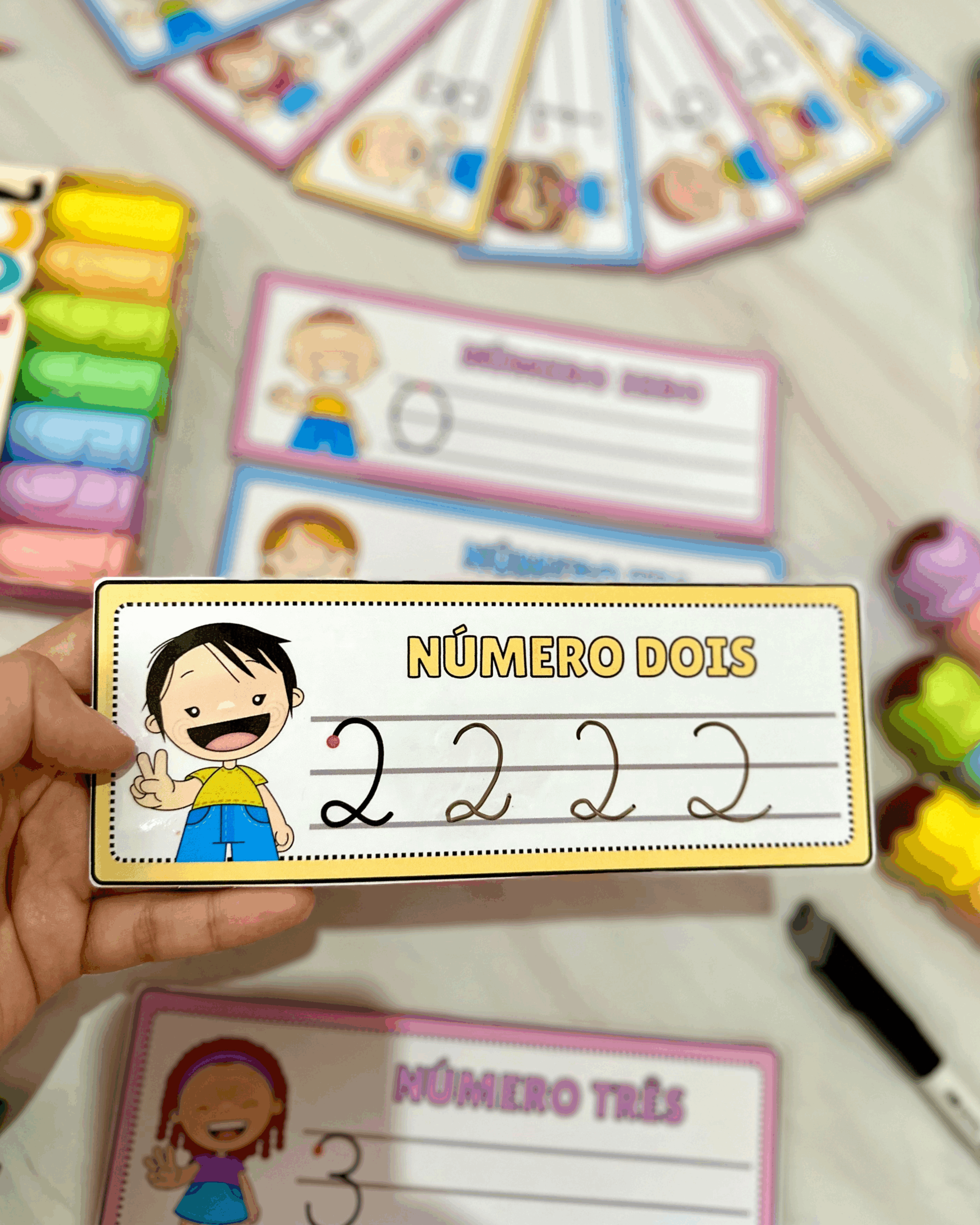 Recomenda-se passar o papel contact nas fichas e utilizar com caneta para quadro branco, dessa forma a criança consegue traçar e apagar os numerais sempre que desejar, sem danificar o material.